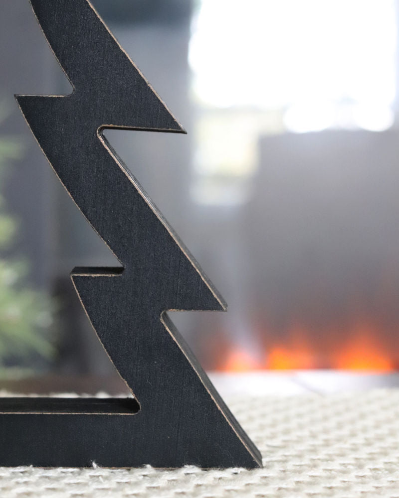 Take your Christmas decor to the next level with our unique Black Wood Tree Cutout. This decorative piece boasts a charming tree cutout shape, perfect for creating a whimsical backdrop. Add a battery votive candle and winter greenery to enhance its farmhouse appeal. Made with whitewashed wood and a slightly distressed finish, this tree cutout exudes rustic charm. Due the design process and natural materials, imperfections are part of the charm. Sold individually. Candles and accessories sold separately.