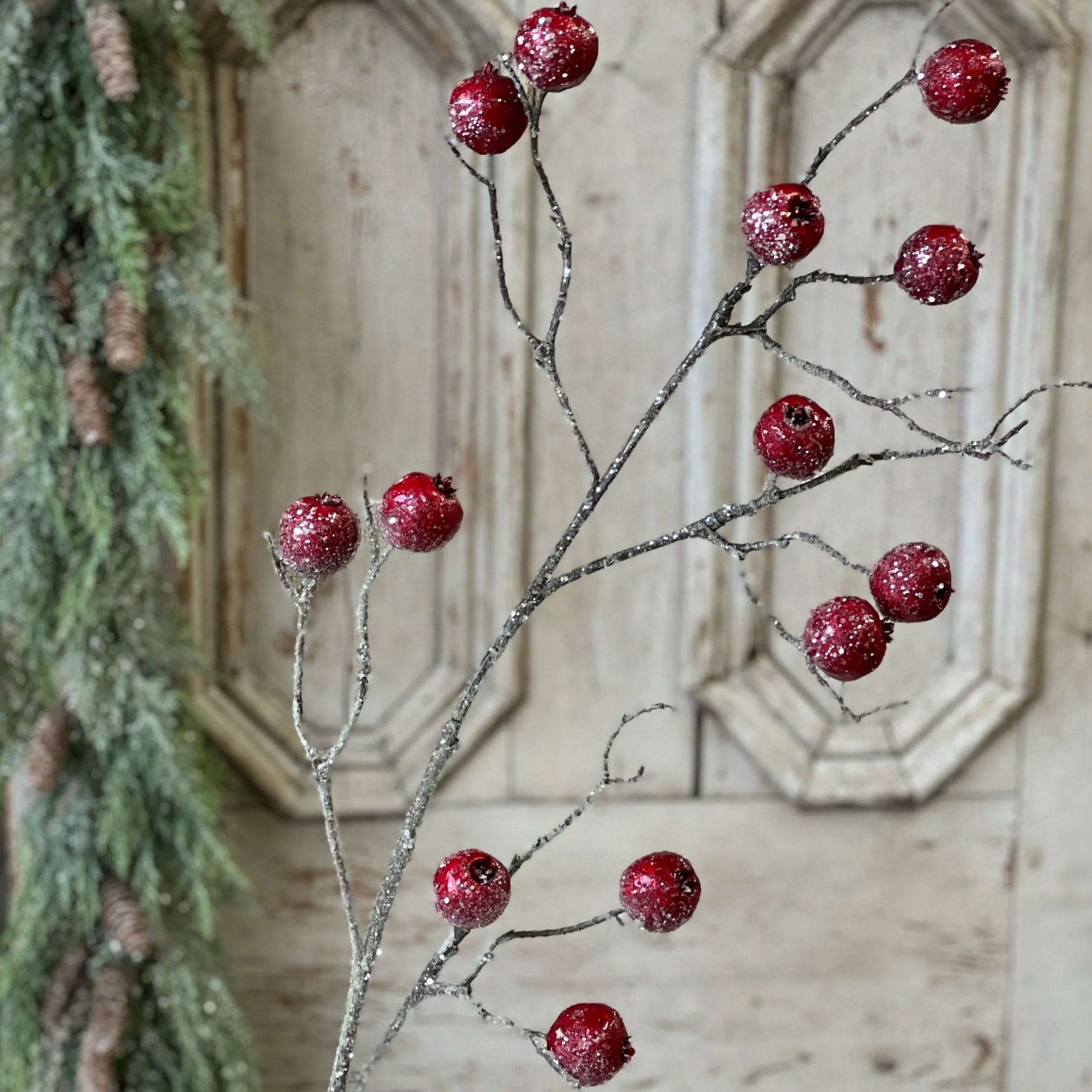 The Sparkling Bauble Berries add a festive note to your holiday displays! Branching stems are topped with showy red berries accented with ice and glitter to create an attention demanding stem. Stem too long? Simply cut to size! Accessories not included.