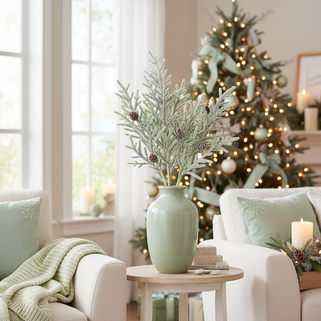 Create a timeless holiday aesthetic with the Snowy Juniper Stem. This elegant wintery piece offers a classic and sophisticated look featuring snowy branches and mini pinecones. Ideal for the elegant look, this versatile greenery can be used on its own or incorporated into a festive Christmas arrangement. Let this timeless greenery be the perfect addition to your holiday décor. Stem too long? Simply cut to size! Accessories sold separately.