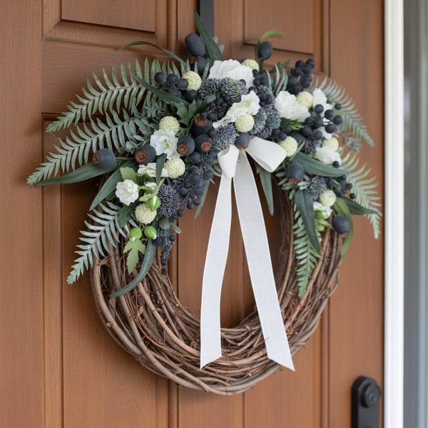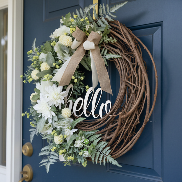 Hello White Dahlia and Yellow Allium Fern Wreath