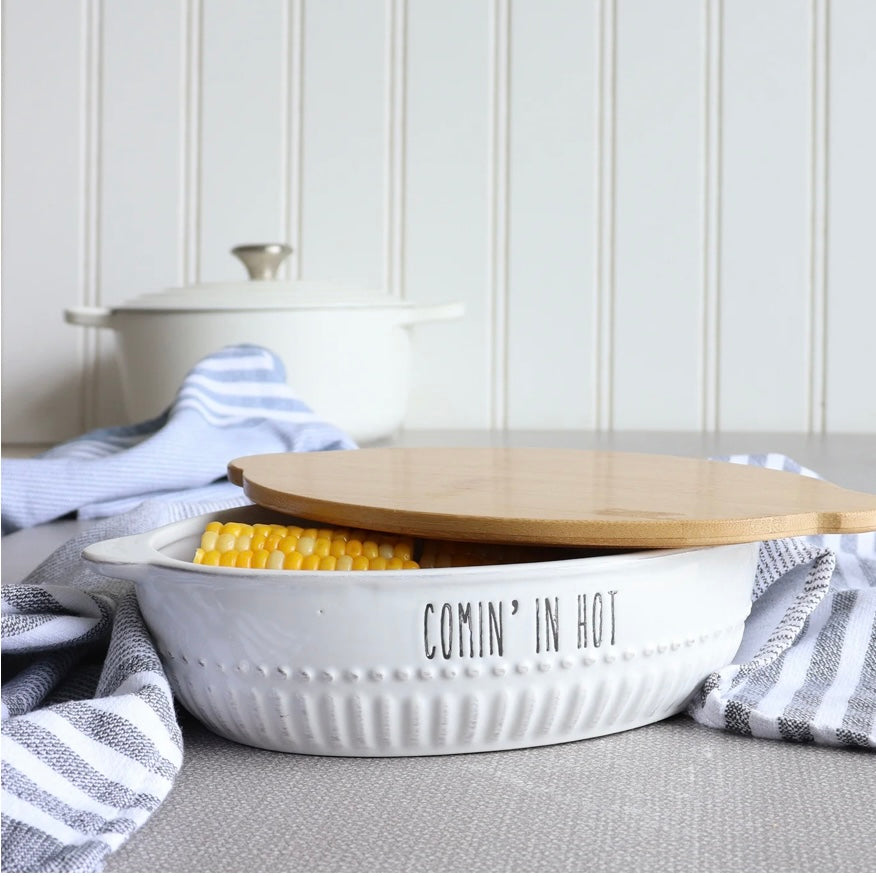 The Comin' In Hot Dish is elegantly designed to present a variety of dips, sauces, or sides with style. Its refined form enhances any table setting, making it ideal for sophisticated gatherings. The included wood lid ensures effortless serving, combining practicality with graceful presentation. Due to the design process minor imperfections and variations are part of the charm. Accessories not included.Â