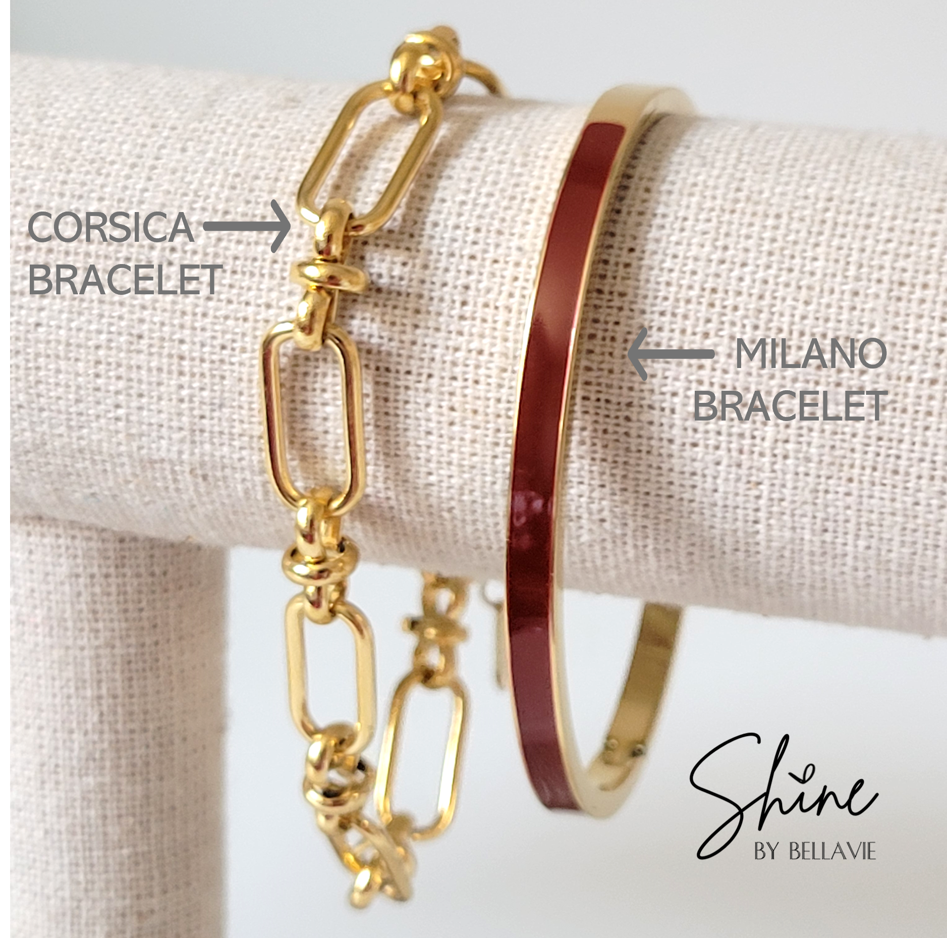 STYLE TIP: Layer in coordinating color with our Brooklyn bracelets, try one of our chic gold link bracelets, Corsica or Marina, or our classic bangle styles, Strada or Rialto.