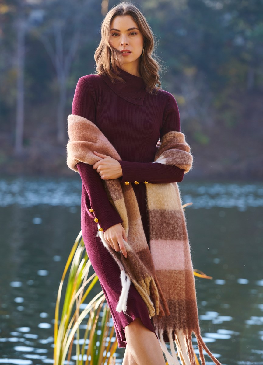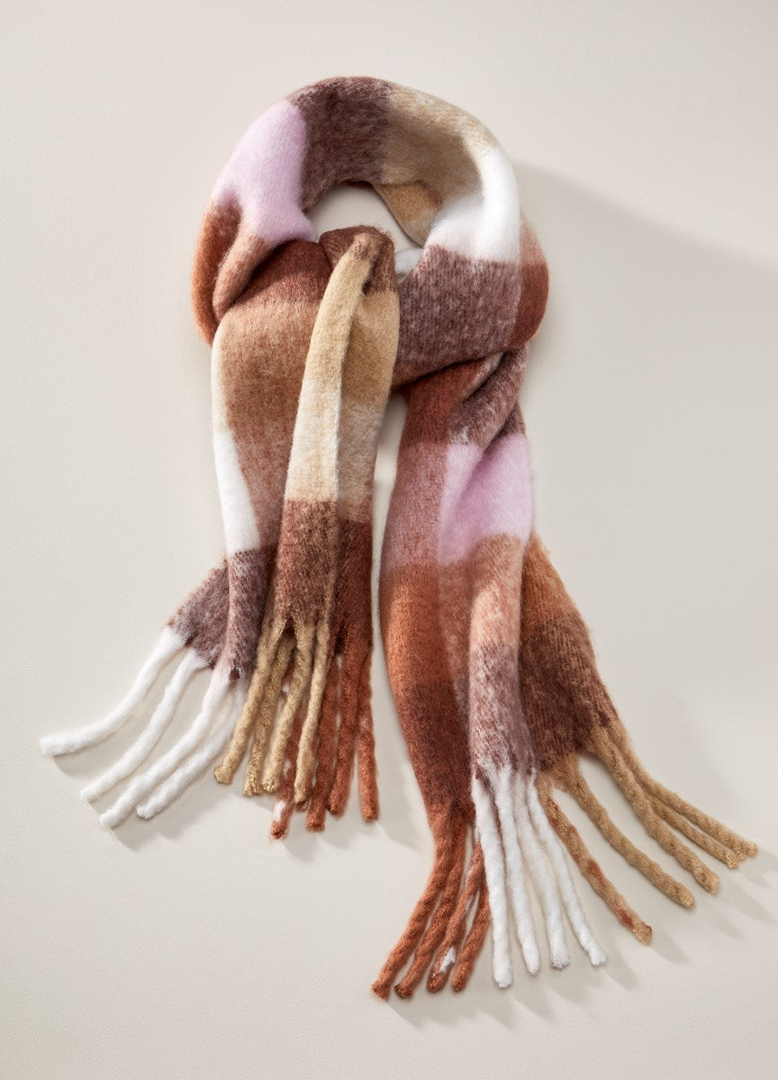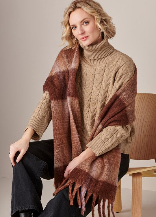 Oversize wrap able scarf in bold, sophisticated stripes, edged with large braided fringes all with a luxurious lofty, super soft hand in an exquisite double brushed woven fabric