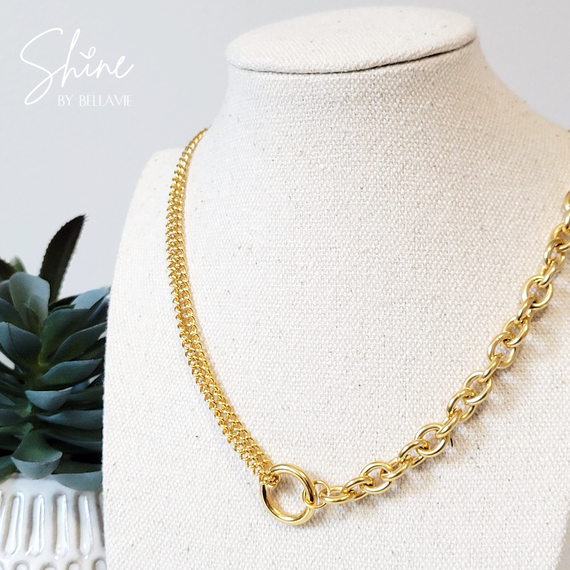 Our Giorgia Multi Link Necklace is your ticket to effortless cool. This gold beauty flaunts half curb link and half cable link in one captivating design—think of it as two necklaces having a stylish conversation. The mixed-texture approach keeps things visually interesting without trying too hard, making it the perfect statement piece for anyone who loves a little personality in their jewelry. Layer it, wear it solo, or let it be the star of the show.