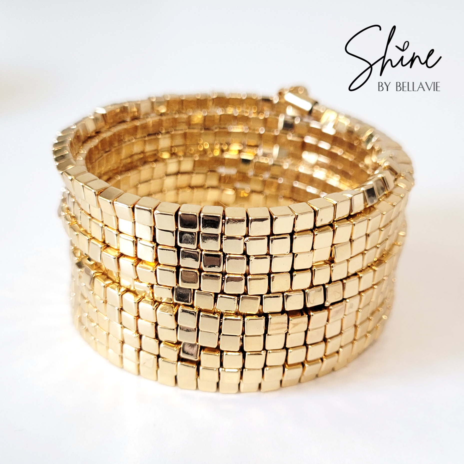Intense shine with a modern, square bead make this wraparound bracelet the epitome of cool girl style. Wear with jeans and a moto jacket or add to a dress for a special night out.