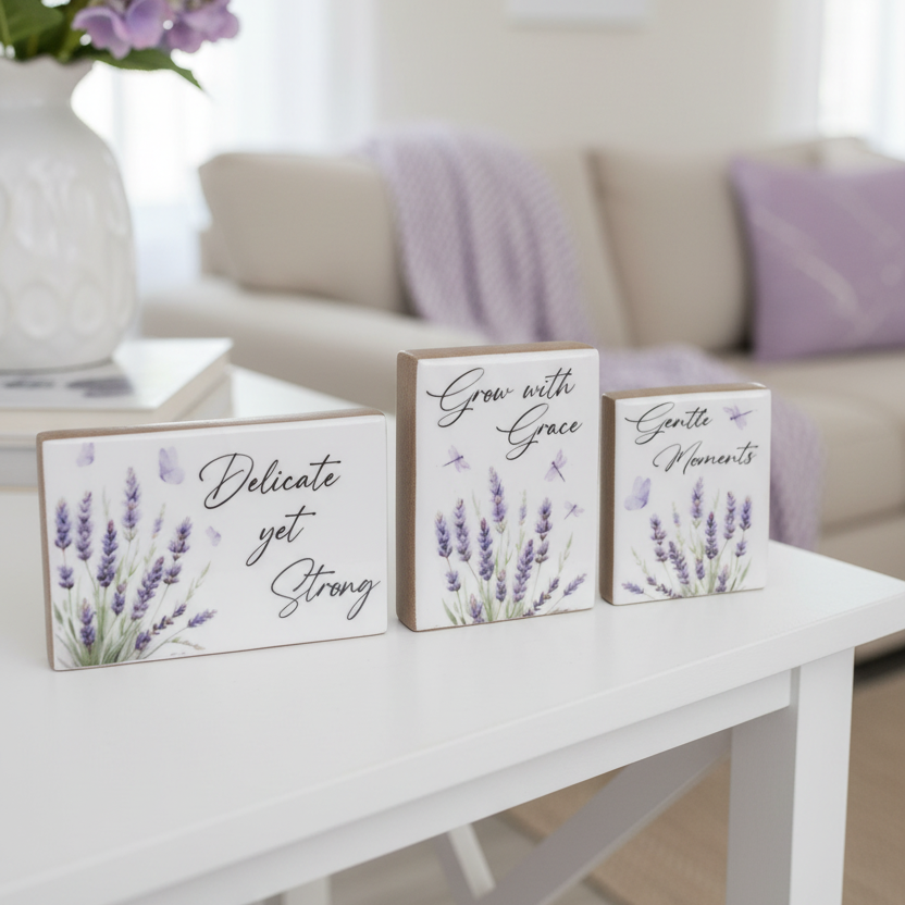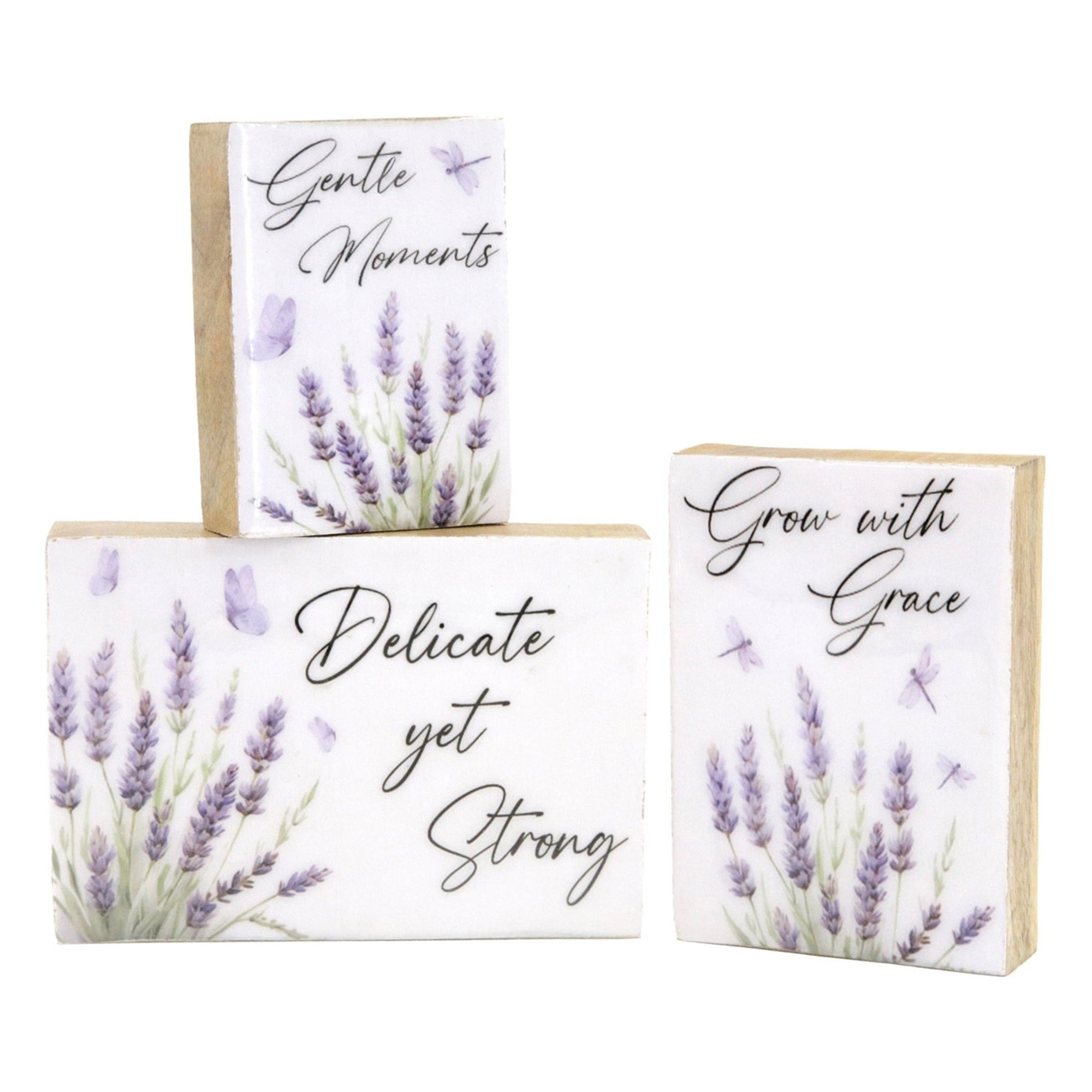 These charming Lavender Sentiment blocks bring a cheerful spirit to any display! Perfect for adding a whimsical touch to your spring or summer décor whether perched on a shelf or nestled among your decor, these delightful blocks give a daily reminder of what's important. Due to the nature of material and design process, minor imperfections and variation including the cut of wood are part of the charm. Each block is perfectly imperfect. Sold individually. Accessories not included.