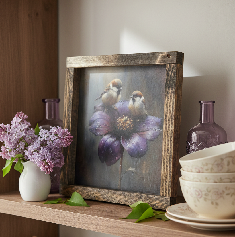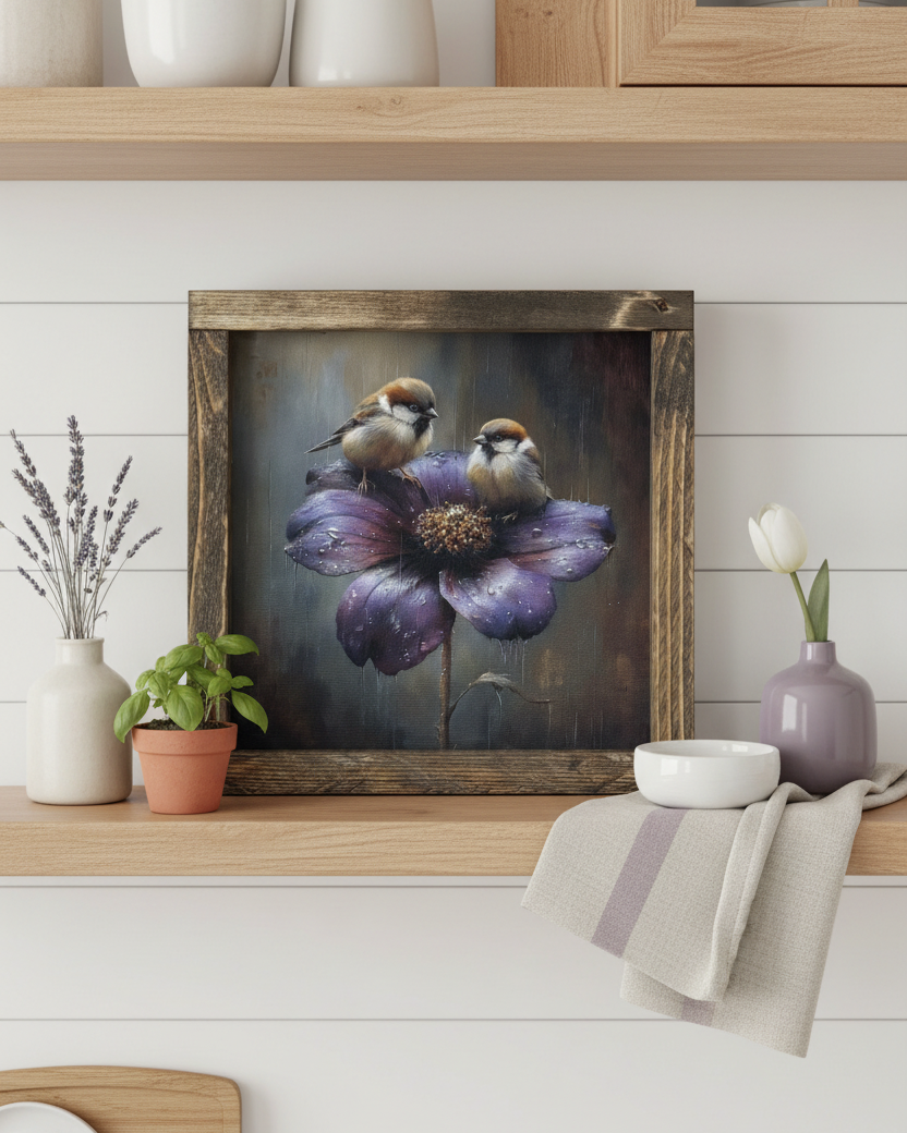 Introducing the Petals After Rain Canvas Print. A locally-made art piece made for those who wish to capture the sweet charm of spring. With a wood frame, this piece featuring an adorable bird duo is the perfect addition for any animal lover. Embrace the charm and exclusivity with this charming print to your home decor. As each item is made by hand and due to the design process, minor imperfections and slight variations are part of the charm. Lifestyle mockups are for inspiration. Made in Canada