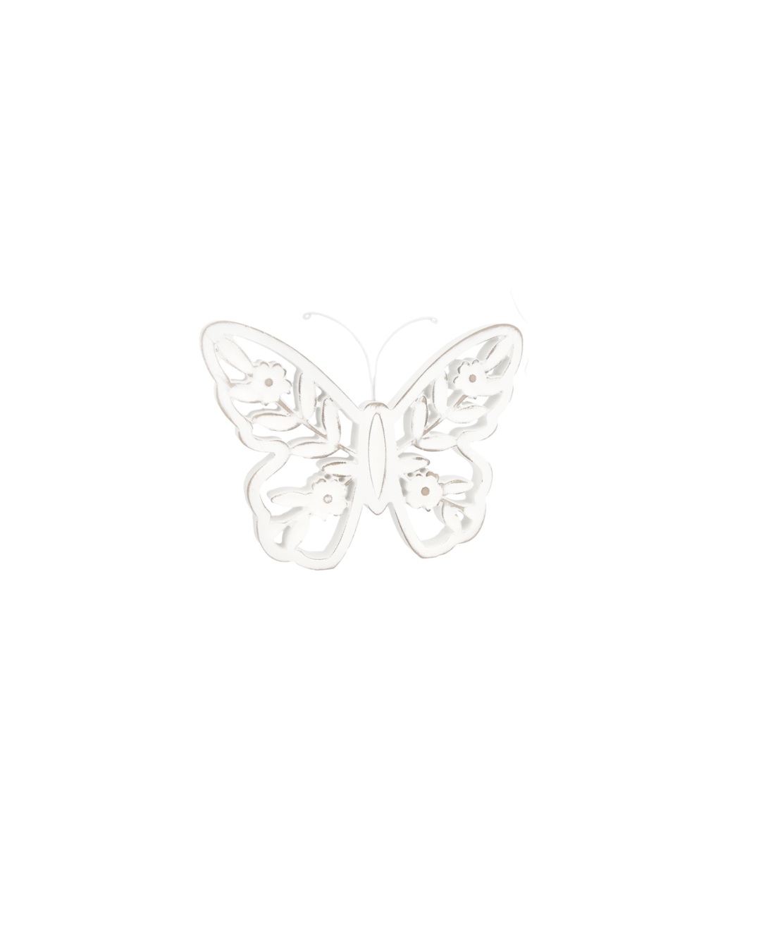 Add some summer charm to your home with a White Distressed Cutout Butterfly Block. The detailing and distressed features make it the perfect addition to any shelf, bookcase, or mantle. It's a charming and beautiful piece that will brighten up your space all spring through summer. Accessories not included.