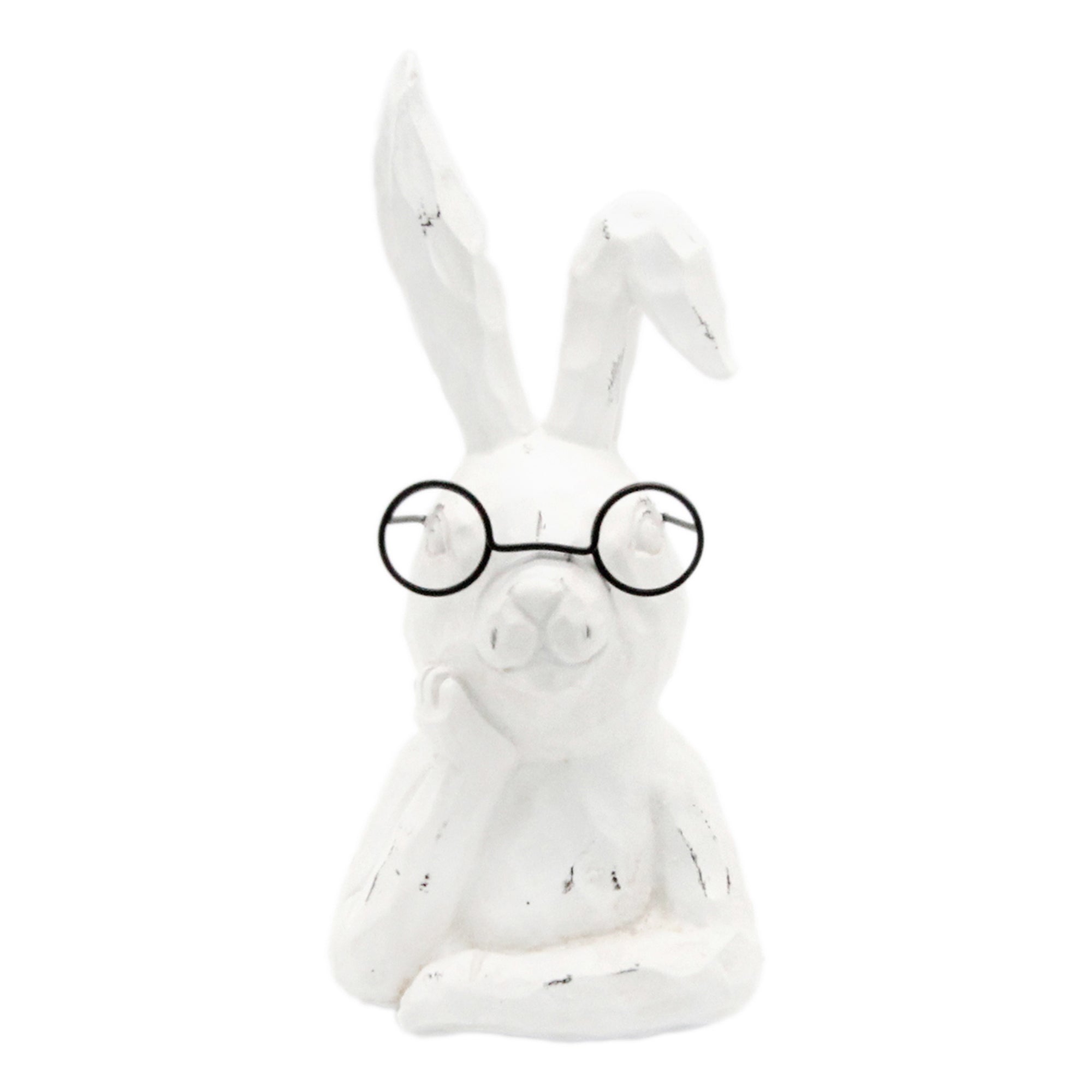 This White Resin Thinking Bunny is sure to bring a touch of charm and rustic sophistication to any space. With its white colour, distressed accents, and adorable glasses, this bunny will provide an effortless blend of vintage feel and style for the Easter or spring/summer seasons. Due to the design process, variations in distressing are part of the charm. Accessories sold separately.