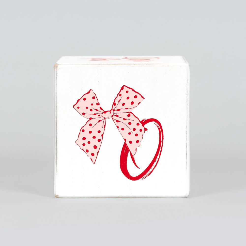 Celebrate Valentine's with this decorative wood cube featuring six sides with different charming phrases and designs, all accented with love motifs in vibrant multicolour: All You Need Is Love, Be Mine, Love You More, I'm Yours, I Love You, A delightful picture of a red ribbon.