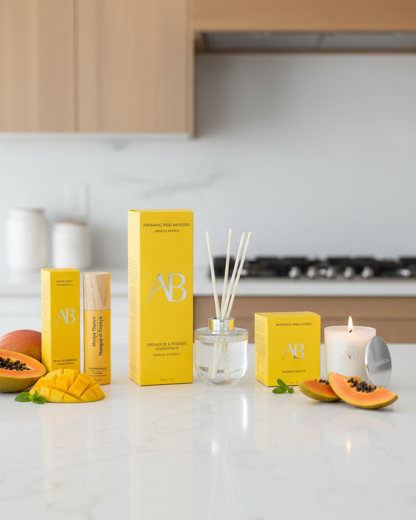 Mango Papaya: A crisp blend of ripe mango, orange, passionfruit and juicy papaya with floral notes of jasmine and a touch of vanilla and sandalwood