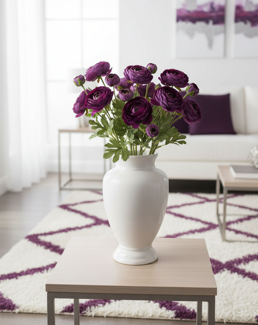 Indulge in timeless elegance with our Dark Purple Ranunculus Real Touch Stem. This realistic-to-the-touch and lifelike faux floral will add a touch of sophistication to any space, reminding you of the classic beauty of Ranunculus even after their blooming season. Perfect for year-round enjoyment, this stem is a must-have for any summer floral enthusiast. Stem too long? Simply cut to size! Sold individually. Accessories not included.