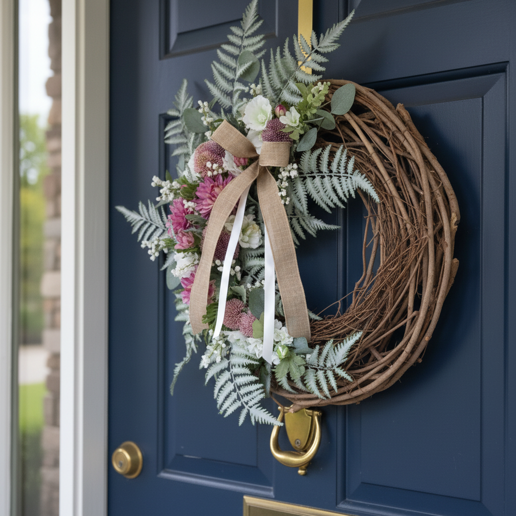 Material: Grapevine, Artificial Florals & Greenery, Wood, Fabric