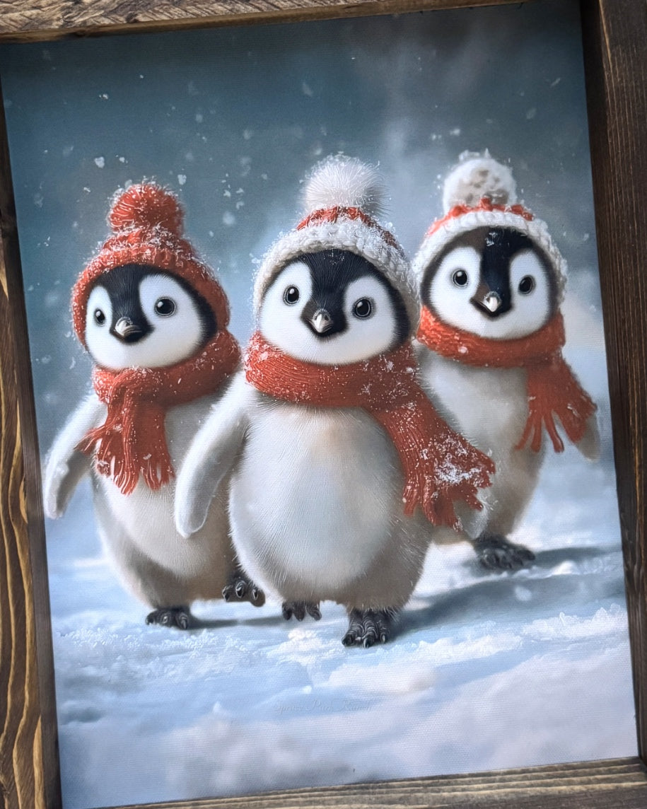 Introducing the Snowbound Cheer Canvas Print. A locally-crafted artwork that captures the serene beauty and essence of those who love the holiday season. This refined canvas print elevates any space with its calm and traditional feel. With a wood frame, this piece features three sweet penguins making their way through the snow. Embrace the charm and exclusivity with this addition to your home decor. As each item is made by hand and due to the design process, minor imperfections and slight variations are part of the charm. Lifestyle mockups are for inspiration. Made in Canada.