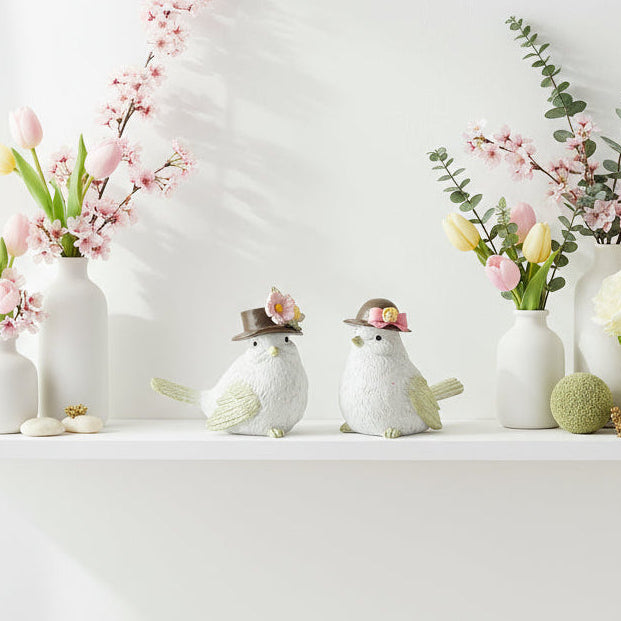 The sweet design of these resin birds make them easy to mix into existing home decor. They have a textured finish with subtle spring details. Create a grouping for your book shelves, mantel, or tray decor. Sold individually. Accessories sold separately.
