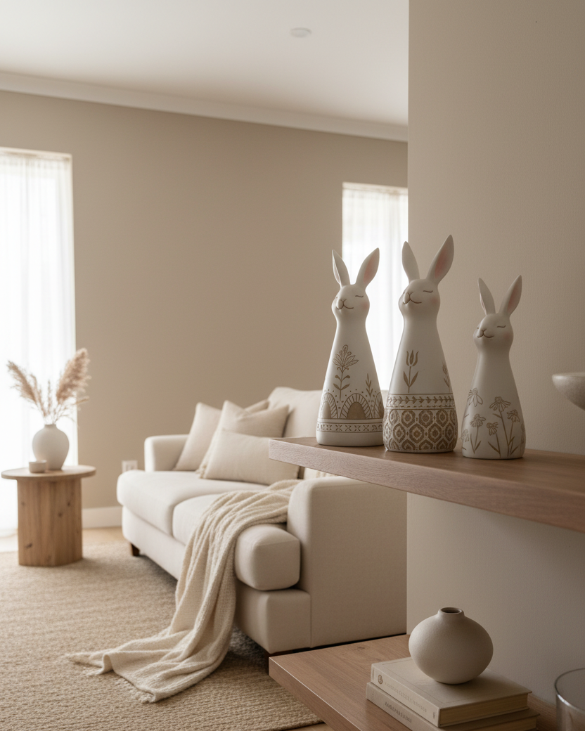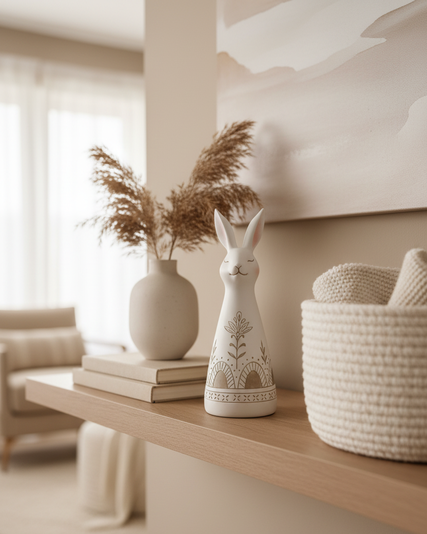 The fun design of these Tall Botanical Rabbits make them easy to mix into existing home decor. They have a hand-painted fern design in a soft neutral palette. Create a grouping for your book shelves, coffee table, or mantel. Each item is painted by hand and will have an perfectly, imperfect look. No two items will be the same. Due to the design process, variations and imperfections are part of the charm. Sold individually. Accessories not included.