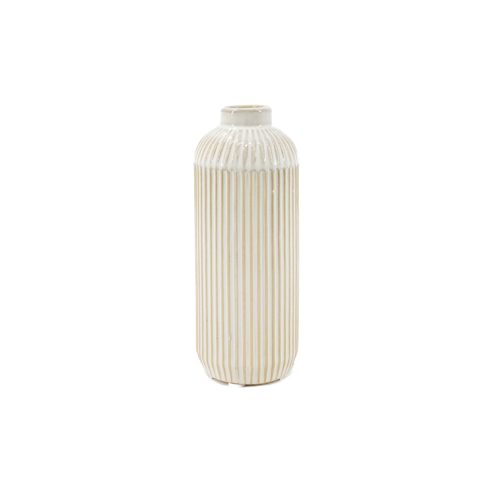 Spruce up your space with an off-white line engraved ceramic vase. The textured off-white colour palette adds a touch of charm that can be used everyday. Create a stunning display with simple faux florals or greenery, or let it stand alone on any bookshelf. Decorate for every season! Sold individually. Accessories sold separately.
